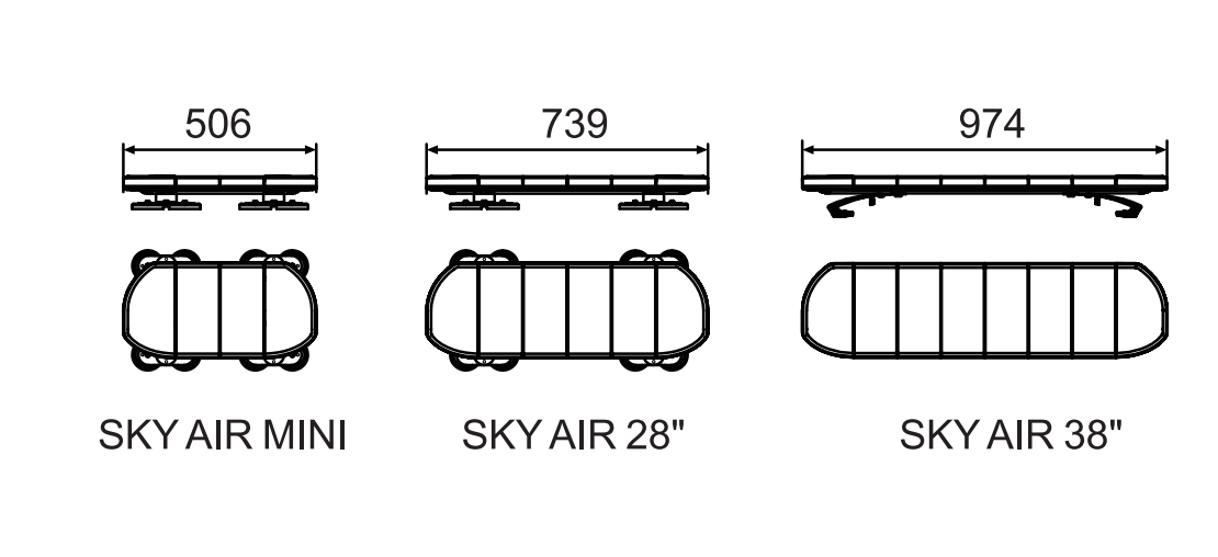 SKY AIR38: 38″L x 9.8″W x 1.8″H(97.4cm x 25cm x 4.5cm)
