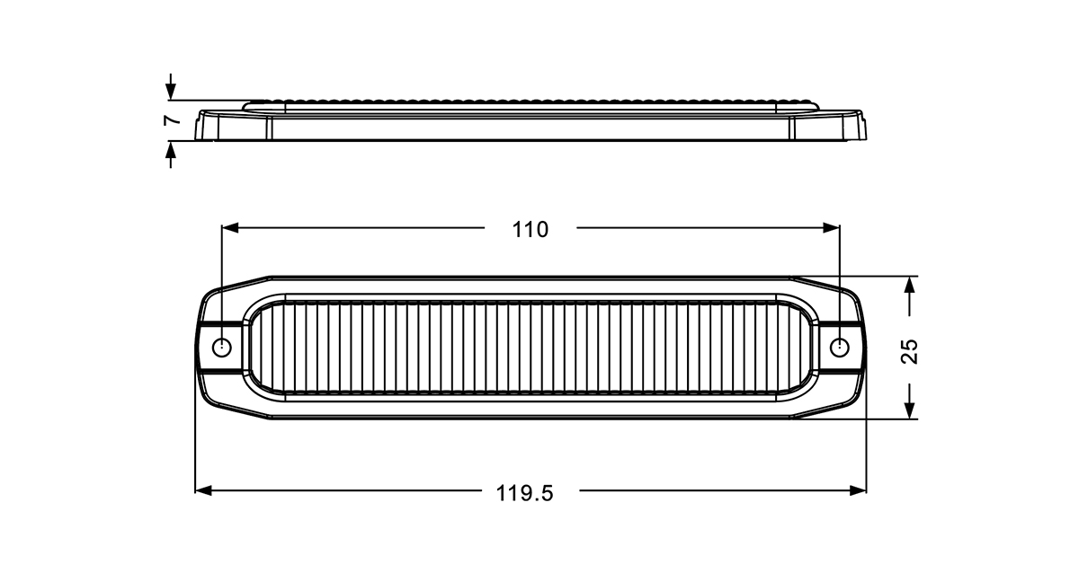 022701A | FIN6 | DC10-33V|MAX 10W|119.5*25*7MM|Transparent lens|Outer cover black|6 amber LEDs|19 flash methods|Screw installation|5-core wire|IP67\IP69K |