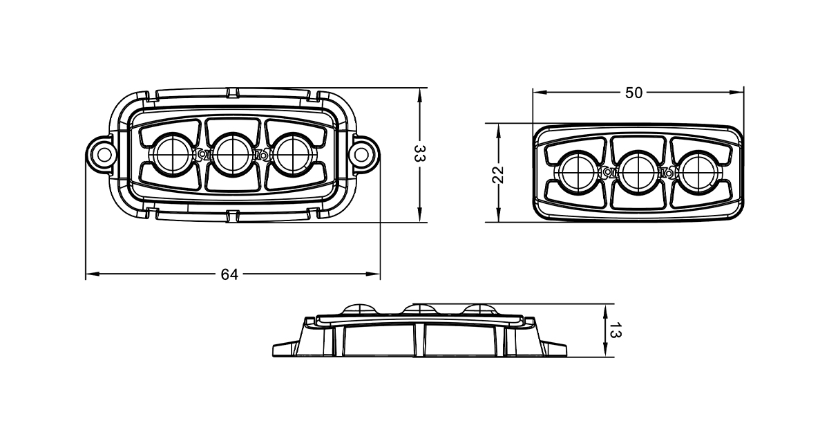 021201A | F3 | DC10-33V|MAX 4.5W|64*33*13MM|Transparent lens|Outer cover black|3 amber LEDs|13 flash methods|Screw installation|4-core wire|IP67\IP69K |