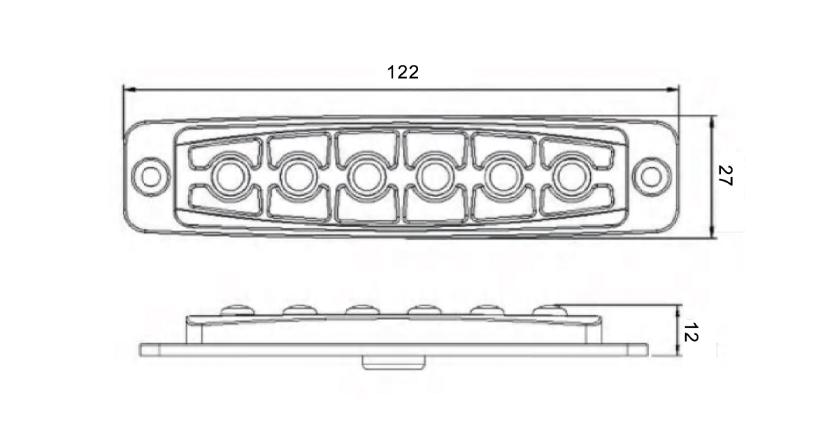 021302A | F6(V) | DC10-33V|MAX 18W|122*27*12MM|Transparent lens|Outer cover black|6 amber LEDs|19 flash methods|Vertical screw installation|4-core wire|IP67\IP69K |