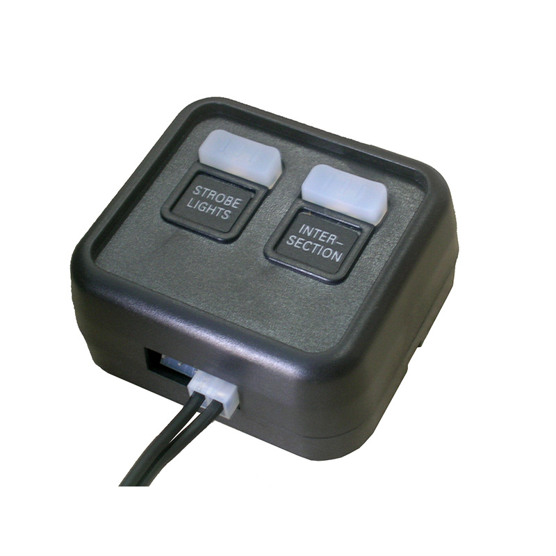 Switch box features two buttons. The first button allows emergency personnel to turn the connected lights or sirens on or off, and the second button allows a controller to change modes. For instance, patterns can be changed with the mode button.