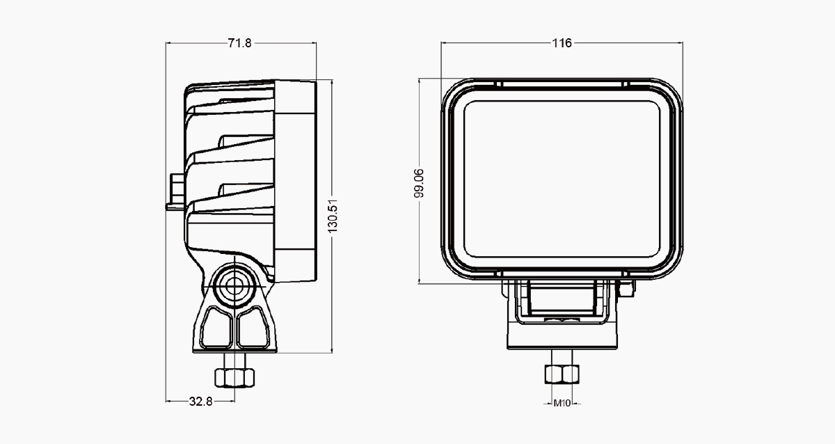 120351 | V18 | DC10-33V|MAX 30W|116*99*72MM|Reflective cup|Back cover black aluminum alloy|6 white LEDs|1800LM|6500K|Lightening angle 28° horizontally 13° vertically|Plastic nylon bracket installation|2-core connector DT04 -2P|IP69K |