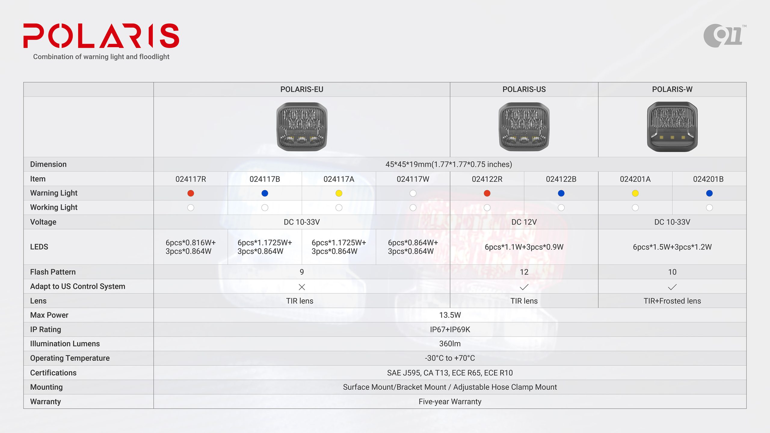 024117APOLARIS-EUDC10-33V|MAX 13.5W|45*45*19MM|TIR 镜头|外盖 70% 黑色|6 个黄色 LED*1.1725W|3 个白色 LED*0.864W|360LM||9 种闪光模式|发光角度 H 30° V 8°|螺钉安装|6*22AWG 电线|IP67+IP69K